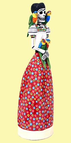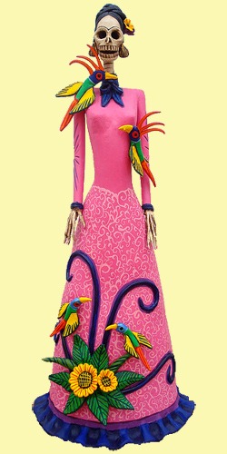 In recent years, Mexican folk artists have combined the imagery of Frida Kahlo with La Catrina, creating hybrid figures known as Frida Catrinas. These sculptures feature the skeletal body of La Catrina with the floral crown, dress, and features inspired by Frida’s self-portraits. The fusion celebrates both women as icons of Mexican identity and artistic defiance.
