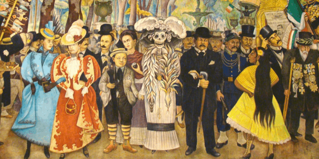 More than three decades later, in 1947, painter Diego Rivera reimagined Posada’s skeleton in his famous mural “Sueño de una tarde dominical en la Alameda Central” (Dream of a Sunday Afternoon in the Alameda). Rivera depicted over 400 years of Mexican history, placing La Calavera Garbancera at the center, elegantly dressed and now renamed La Catrina—a term derived from catrín, a slang word meaning “well-dressed gentleman.”