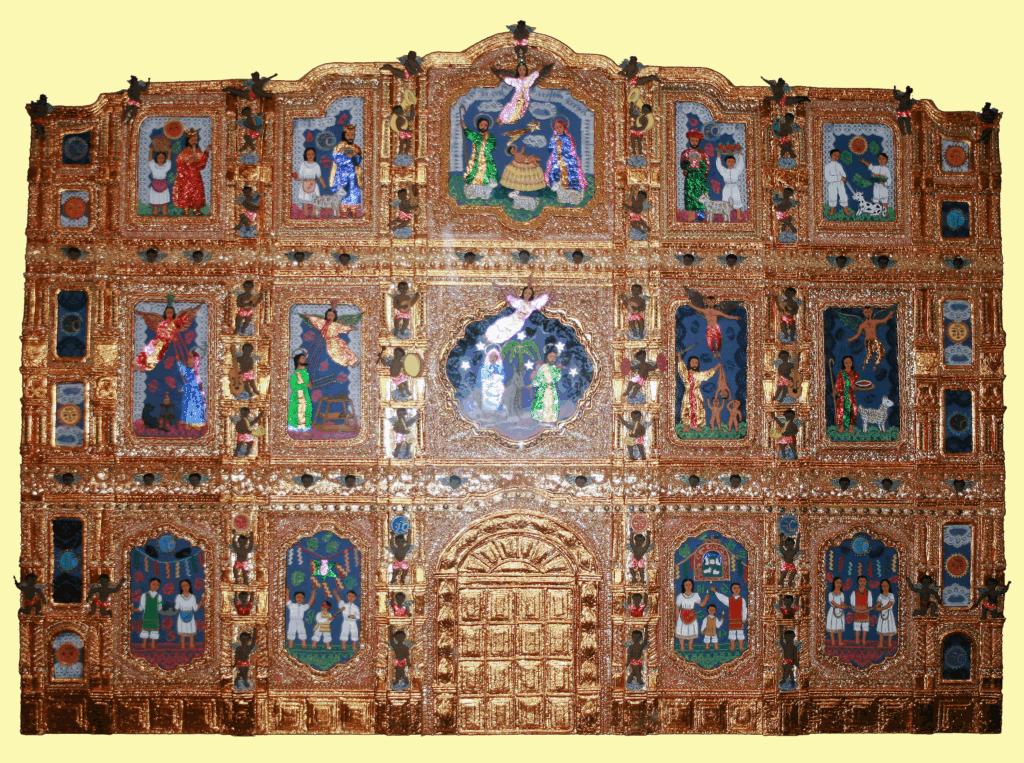 Master artisan Pedro Ortega Lozano, from Tláhuac, Mexico City, has elevated the craft to fine art. Born in 1960 and self-taught, he creates complex compositions using metallic, tissue, and embossed papers. His retablos and altars depict scenes of daily life and mythology, blending popular art with personal narrative.