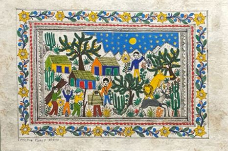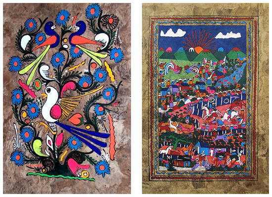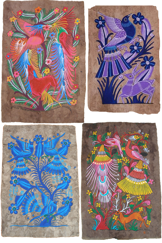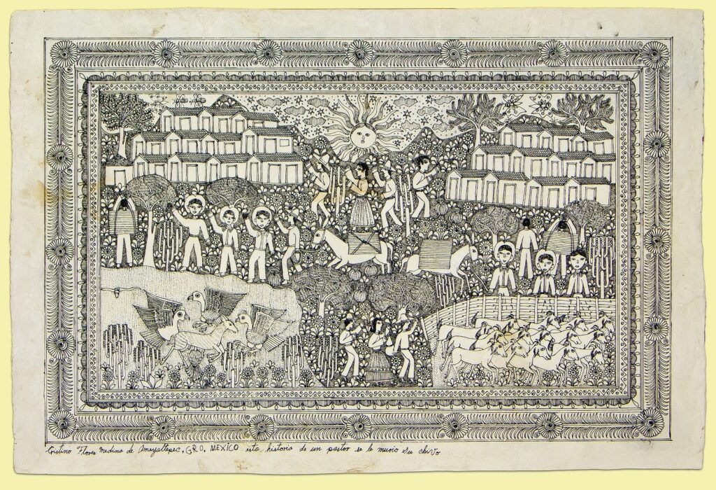 Otomí artisans from San Pablito, Puebla, began selling the paper to Nahua painters from Guerrero, who used it to create intricate paintings of daily life, myths, and festivals.