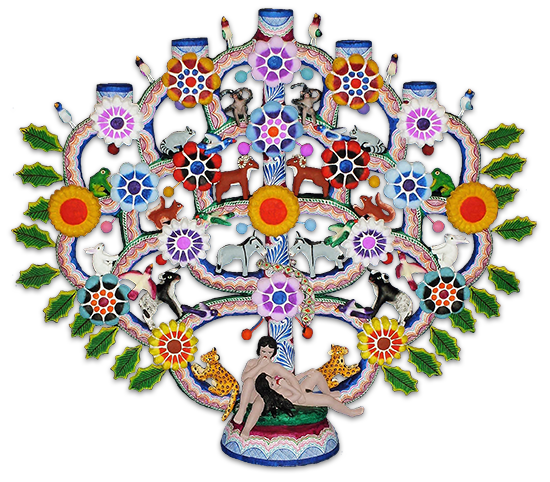 Their candelabra, incense burners, and skulls burst with floral patterns and bright colors. The most famous design, the Butterfly Skull, features skeletons with monarchs emerging from their crowns.